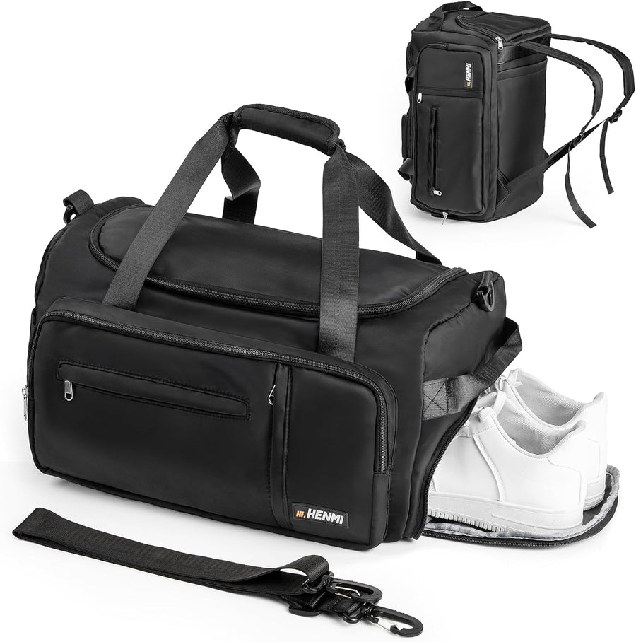 HENMI Sporttasche & Reisetasche für Damen und Herren,43L Groß Handgepäck mit Schuhfach und Nassfach für Sport und Travel Gym Tasche Fitness Rucksack Trainingstasche Faltbare Reisetasche Schwarz